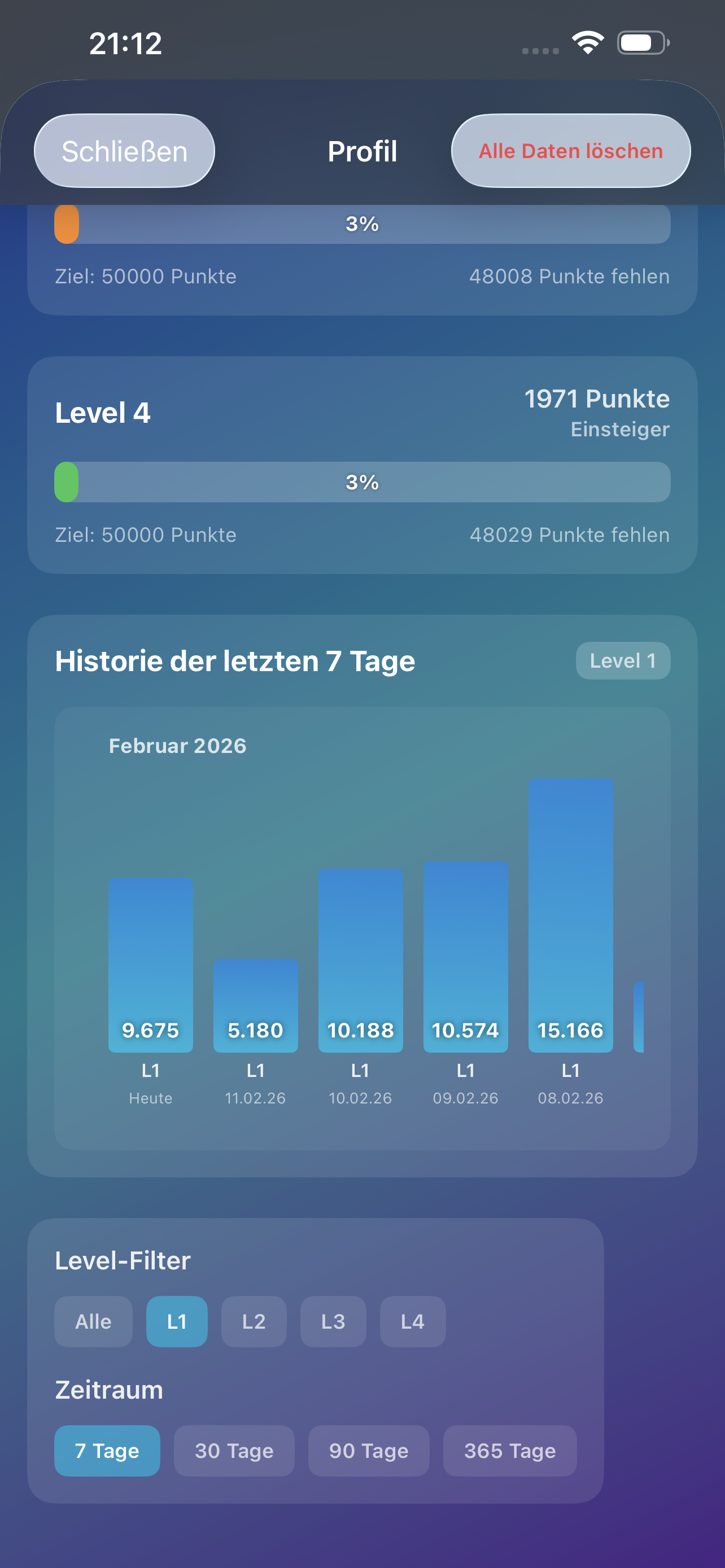 Im Profil siehst du deinen Status pro Level direkt neben dem Fortschrittsbalken.